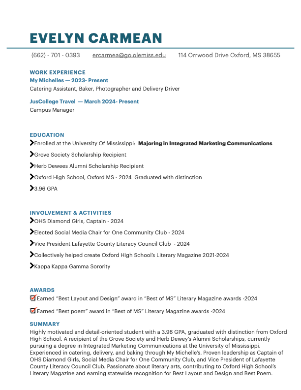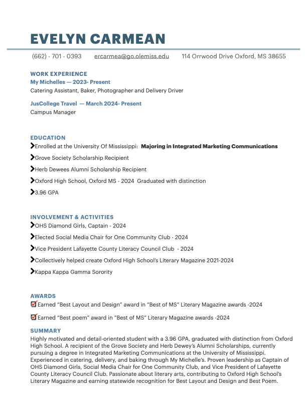 Hi! I’m Evelyn Carmean, a sophomore at the University of Mississippi majoring in Integrated Marketing and Communications (IMC). I’ve been drawn to multiple facets of journalism since I was young, and choosing this field has allowed me to pursue work that is both meaningful and genuinely enjoyable to me.